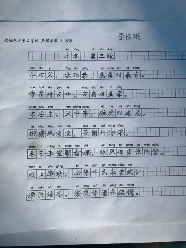 徐安格同学抄写二冬第二段 林贝溪同学抄写一东第三段 程姝菲同学抄写二冬第二段
