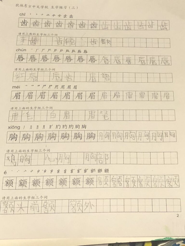 中文书写训练,老师从基础汉字笔画开始讲解,进而让同学们了解汉字的结构形式和偏旁部首。坚持使用田字格,通过描红和抄写练习,规范汉字书写习惯,一段时间后同学们的中文书写都取得了很大的进步。同时,在掌握笔画和偏旁部首的基础上,同学们学习了部首查字法,今后遇到不认识的汉字,也可以很快地通过查字典学习新汉字。