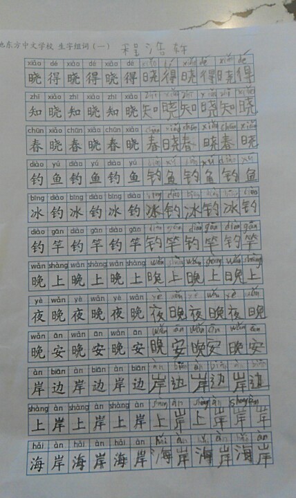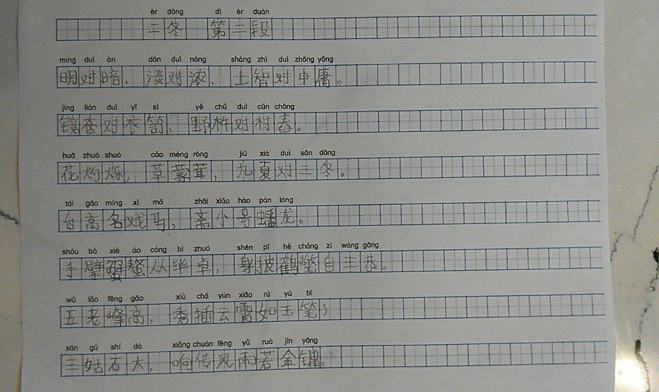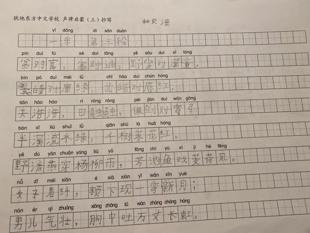 徐安格同学抄写二冬第二段 林贝溪同学抄写一东第三段 程姝菲同学抄写二冬第二段