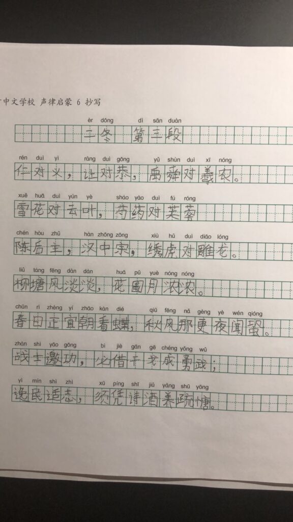 在朗读训练中,综合班的课程主要选学了国学启蒙经典读物《声律启蒙》的篇章。朗朗上口的文字,让同学们对中文朗读产生了很大的兴趣。不经意间,通过一次次的朗读训练,大家领略了中文的韵律之美,并且纠正不太准确的中文发音。