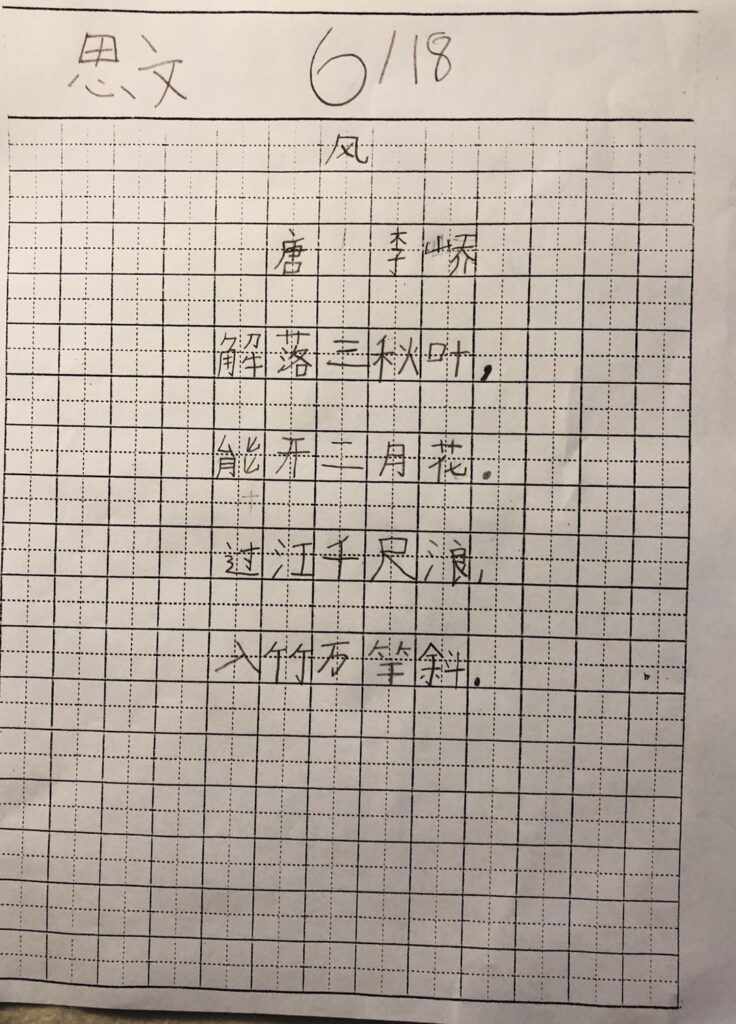 小帅同学抄写生字 程浩轩同学抄写生字 Michael Middleton(钟英杰)同学抄写二冬第三段 陈思文同学抄写唐诗《风》